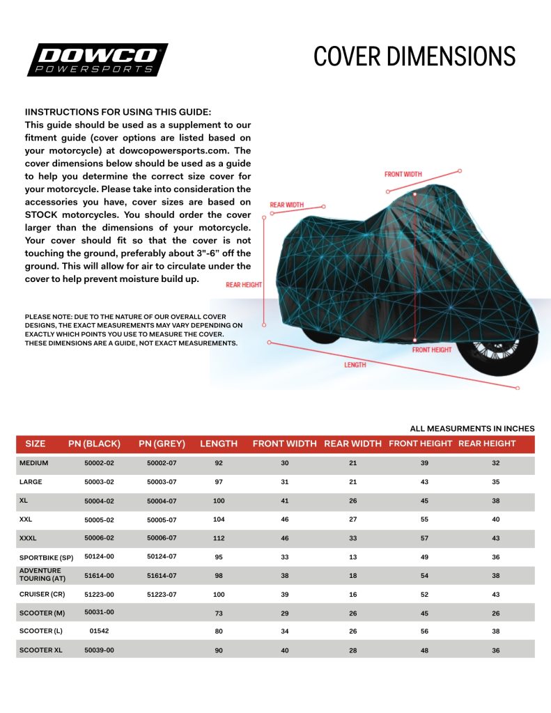 If your motorcycle is stock, or doesn’t have accessories that would change the overall profile of your ride, use the tool below to help find the Dowco Powersports motorcycle cover size we recommend.