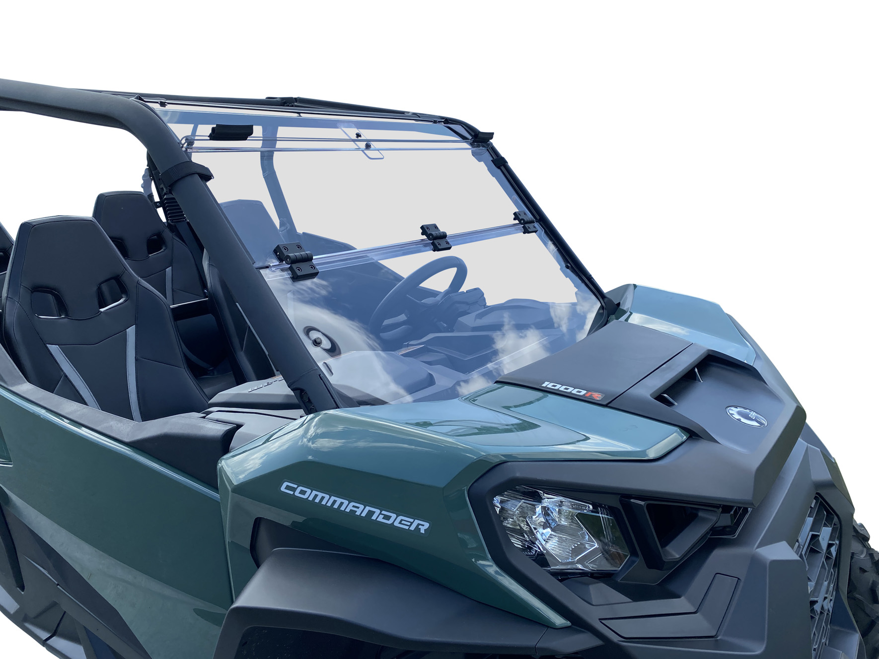 This folding windshield is designed for precise compatibility with both OEM and many aftermarket roofs, ensuring a clean fit without large gaps at the top.