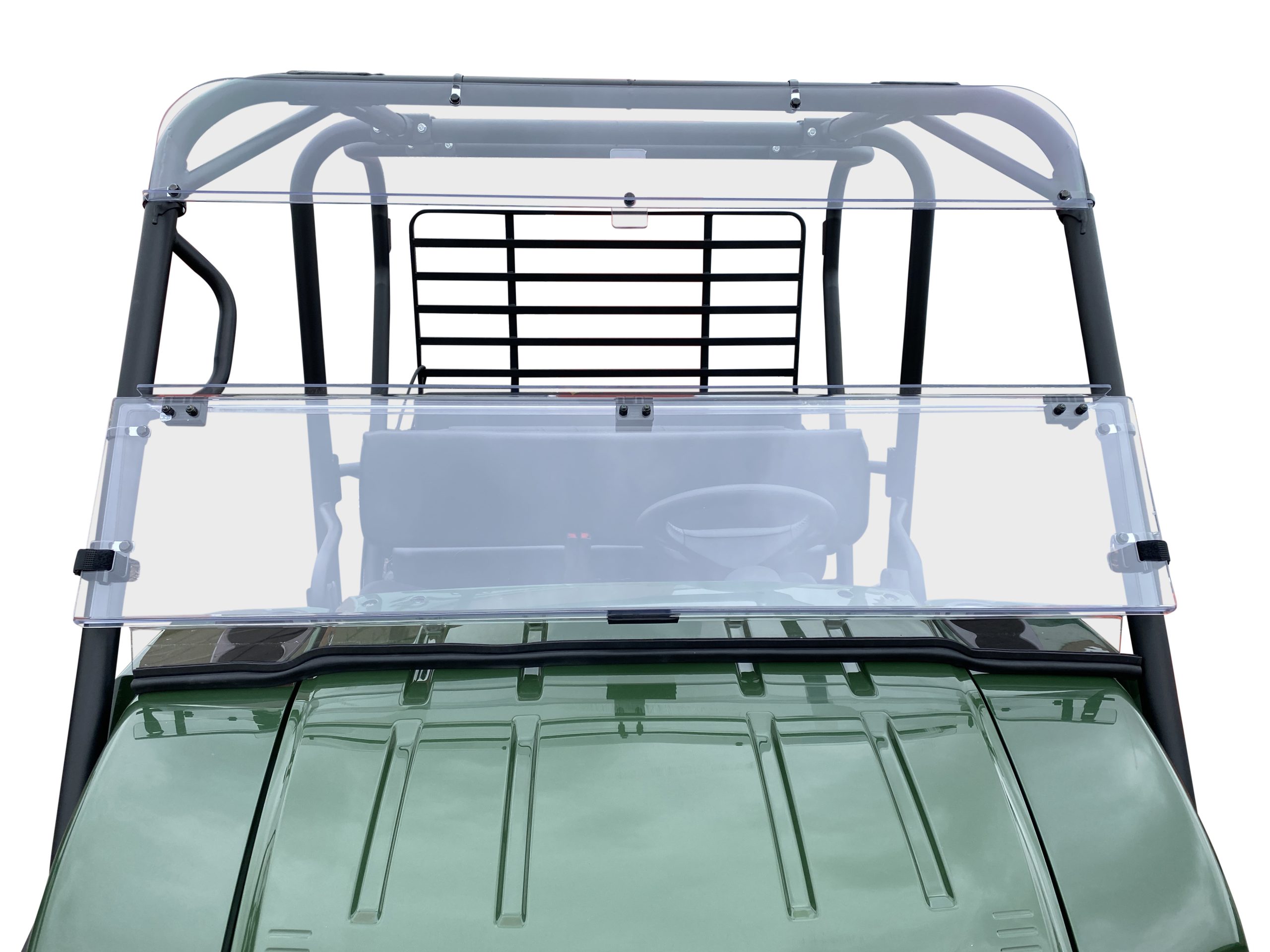 Compatible with the The Kawasaki Mule 4000/4010 folding windshield provides full windshield protection with the option to fold down the middle part of the windshield to allow for better air flow and/or visibility. It is designed to work with the OEM roof while not leaving a large gap between the top of the windshield and roof. The windshield is attached to the roll cage using eight p-clamps. The middle section of the windshield is attached using three hinges with a unique fold to prevent water intrusion at the hinge line. The top of the folding part of the windshield is connected to the roll cage with two hook and loop straps.