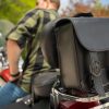 The Willie & Max Sissy Bar Bags are made of synthetic leather. The Black Jack series features a sleek, clean look. This universal bag has an attached carry handle and quick-release buckles. All of the bags are both designed and manufactured in the USA.