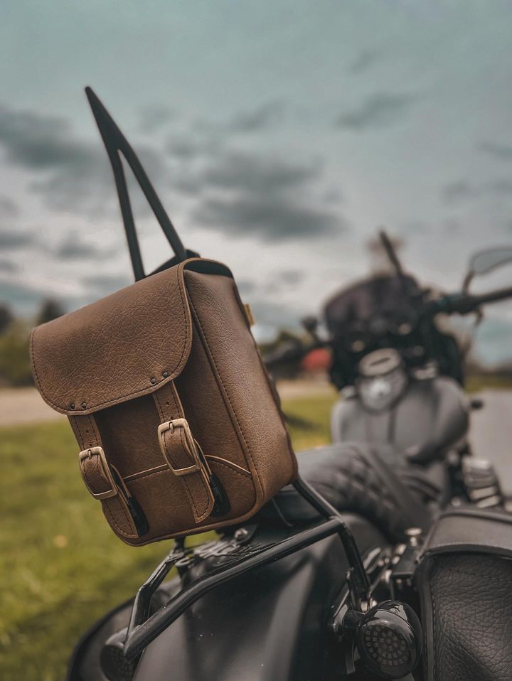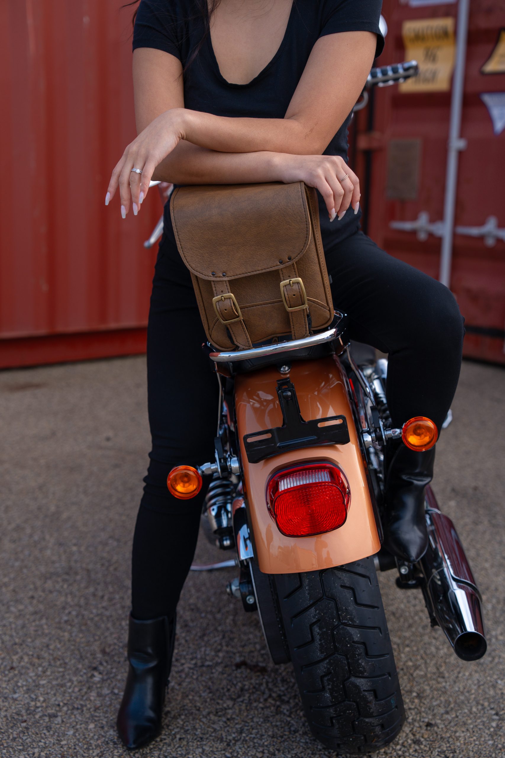 The Willie & Max Brass Monkey Sissy Bar Bag in Warm Brown attaches to your backrest to give you extra storage and a vintage look with warm caramel brown synthetic leather and brass buckle accents. Constructed for durability from reinforced synthetic leather that is water and UV-resistant. Quick-release buckles under the straps provide easy access to your gear.