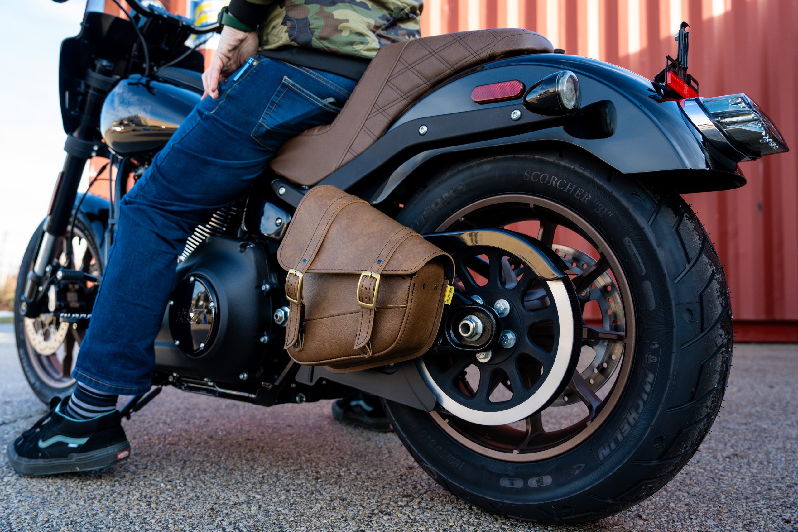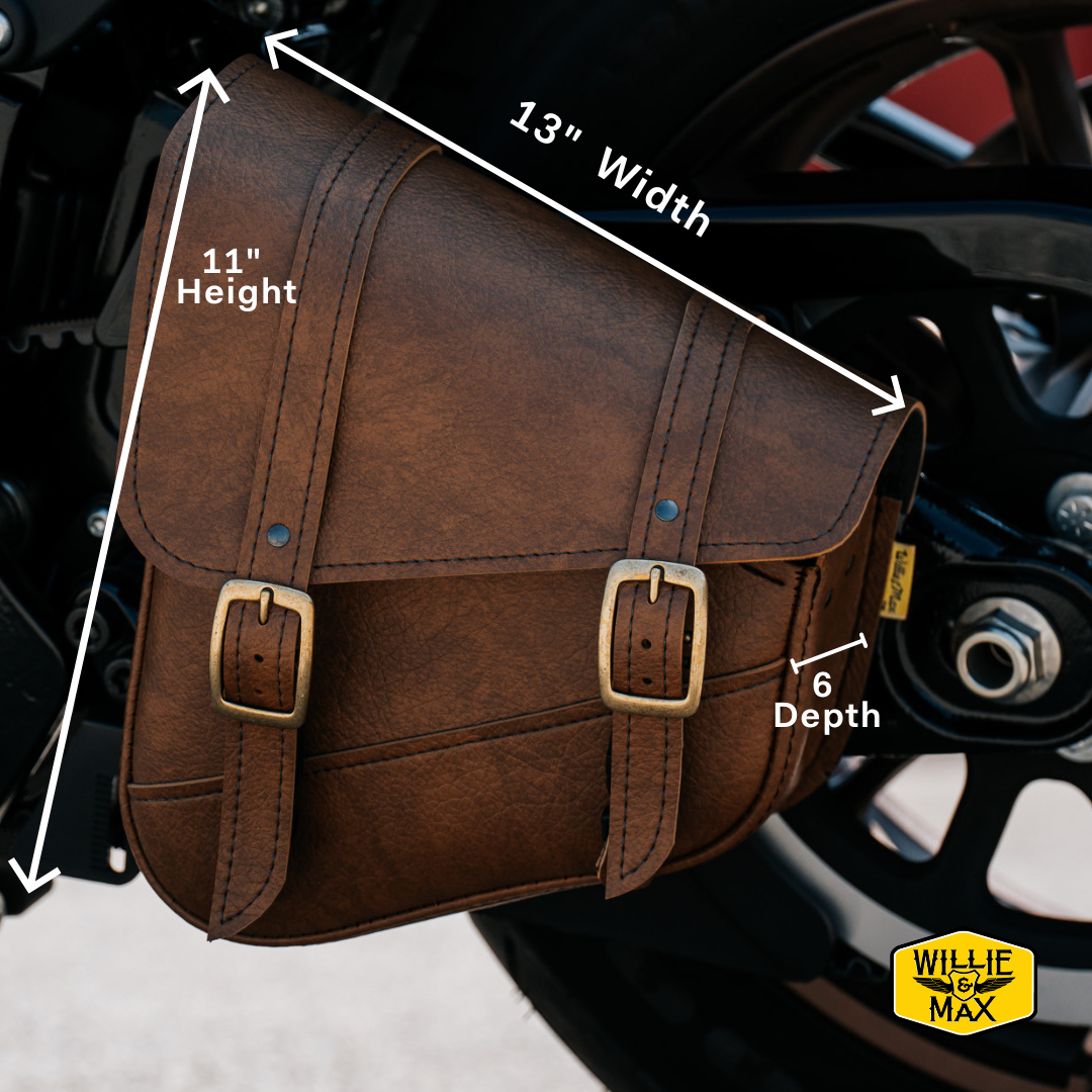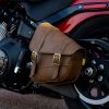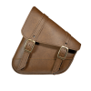 Willie & Max Brass Monkey Swingarm Bag in Warm Brown for Triangulated Swingarms/Softails is a stylish and durable left-side solo bag now in improved warm caramel brown synthetic leather with chrome buckles.