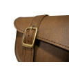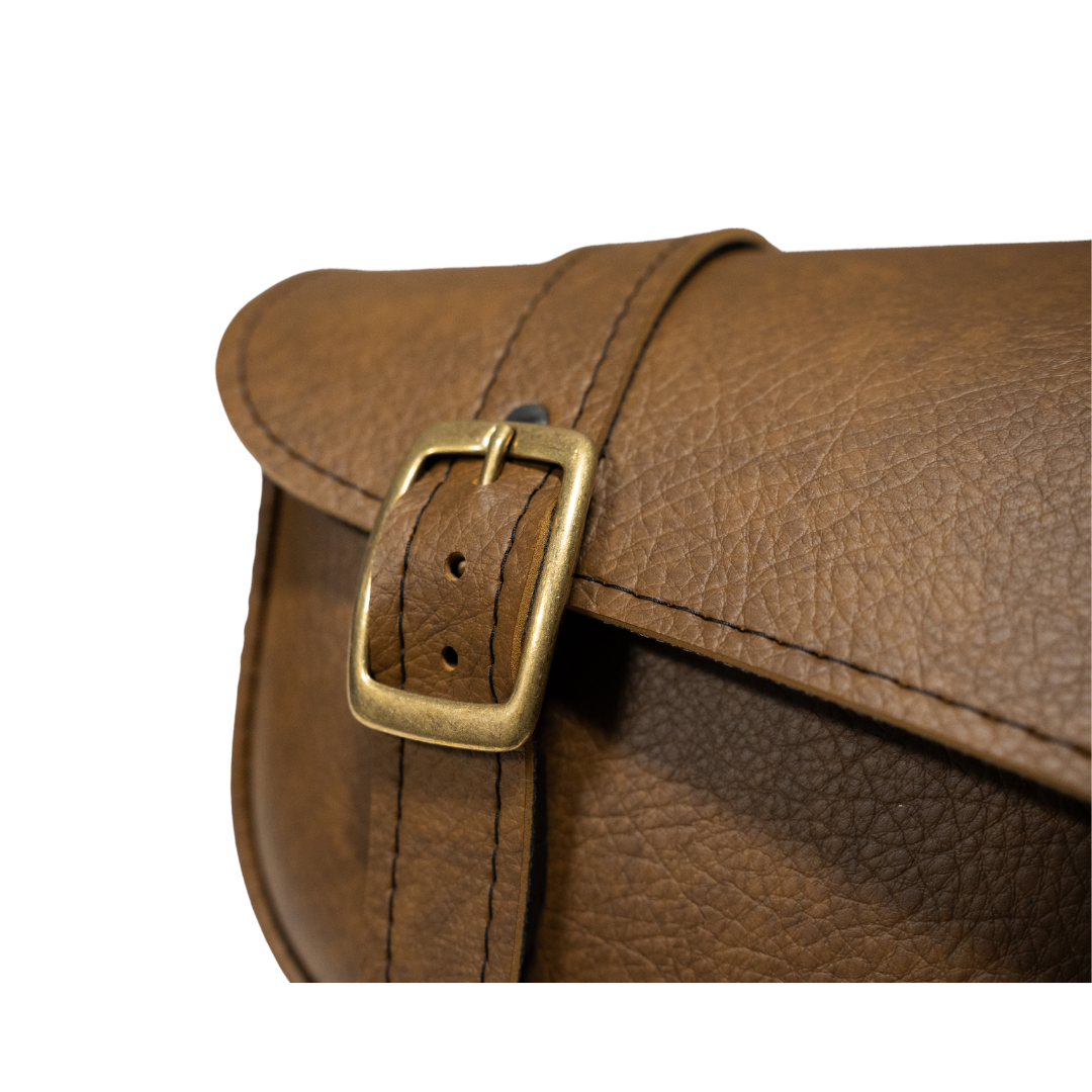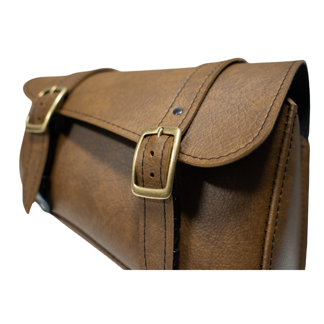 - Durable swingarm bag construction uses warm brown synthetic leather and brass buckles with quick-disconnect buckles hidden under the straps.