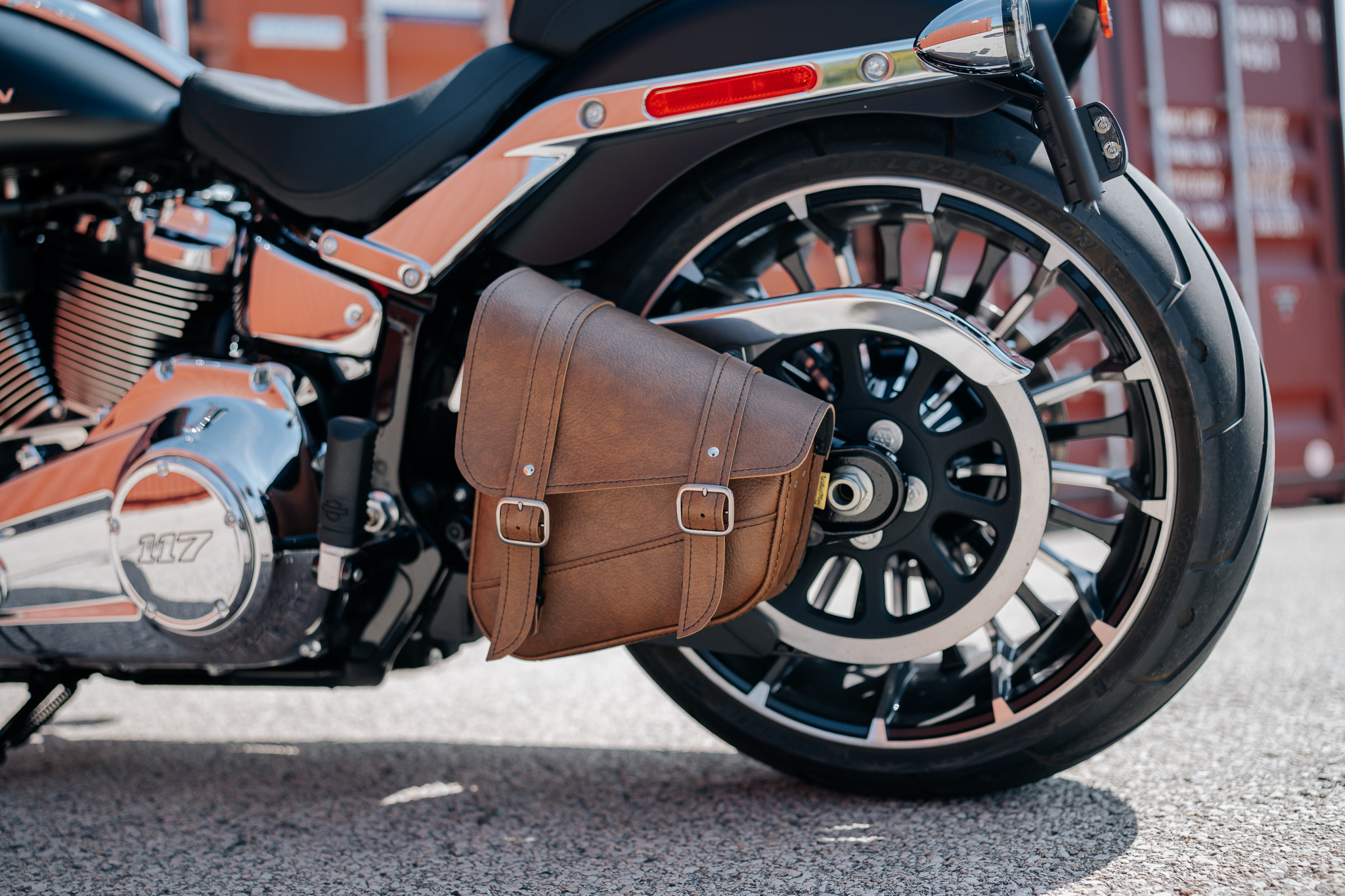 Willie & Max Warm Brown Swingarm Bag for Triangulated Swingarms/Softails is a stylish and durable left-side solo bag now in improved warm caramel brown synthetic leather with chrome buckles.